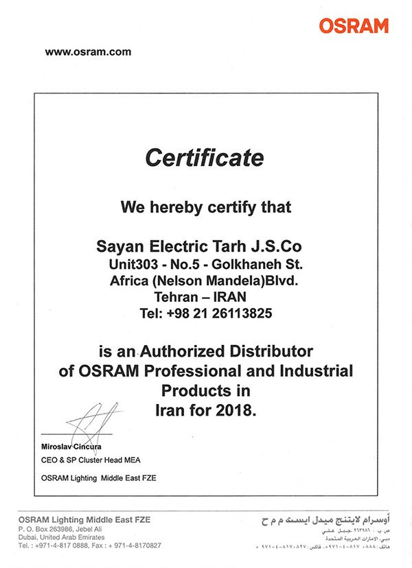 Компания «Саян Электрик» является официальным представителем профессиональной и промышленной продукции немецкой компании «Осрам» в Иране. С более чем 125-летним опытом немецкая компания «Осрам» является одной из ведущих мировых компаний в области светотехнической промышленности. Сотрудничество с этой компанией позволило Саяну Электрику развивать свои продукты и услуги в соответствии с новейшими технологиями в мире.